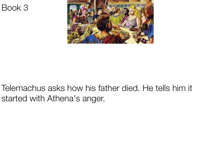 Telemachus asks how his father died. He tells him it started with Athena's anger.