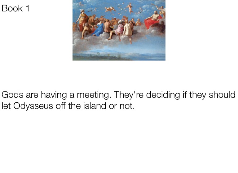 Gods are having a meeting. They're deciding if they should let Odysseus off the island or not.