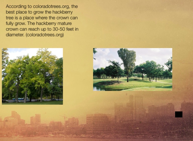 According to coloradotrees.org, the best place to grow the hackberry tree is a place where the crown can fully grow. The hackberry mature crown can reach up to 30-50 feet in diameter. (coloradotrees.org)