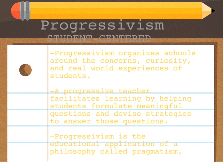 -Progressivism organizes schools around the concerns, curiosity, and real world experiences of students.