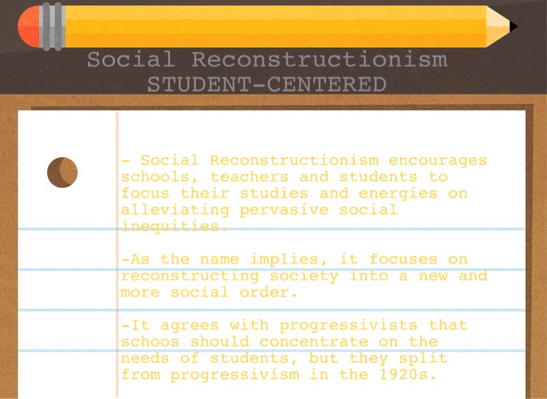 - Social Reconstructionism encourages schools, teachers and students to focus their studies and energies on alleviating pervasive social inequities.