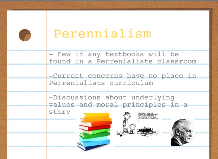 - Few if any textbooks will be found in a Perrenialists classroom