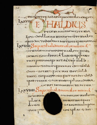 Qui si può vedere un'altra pagina dell'Editto di Rotari, si può capire che è antica, dal fatto che è presente un buco nella pagina.