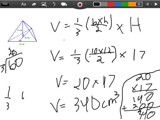 Formula: Volume= 1/3 (bxh/2) x H