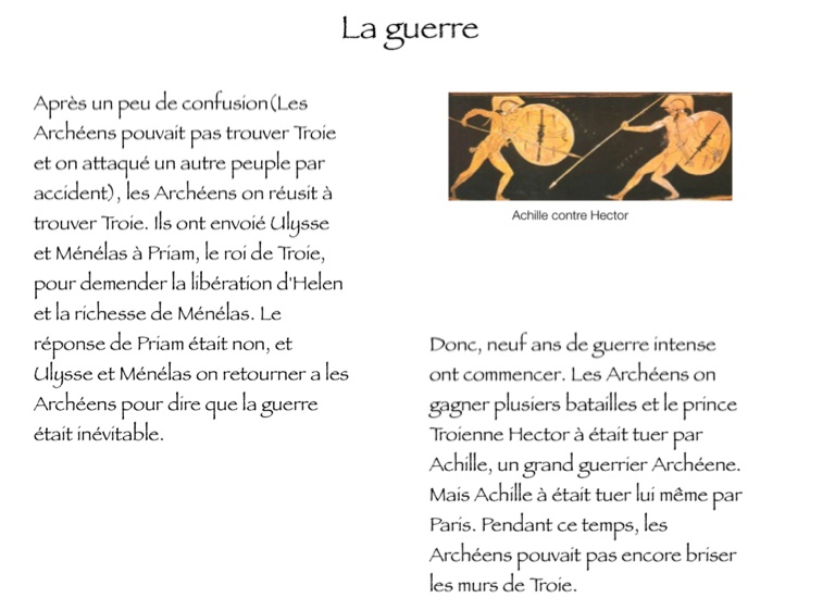 Donc, neuf ans de guerre intense ont commencer. Les Archéens on gagner plusiers batailles et le prince Troienne Hector à était tuer par Achille, un grand guerrier Archéene. Mais Achille à était tuer lui même par Paris. Pendant ce temps, les Archéens pouvait pas encore briser les murs de Troie.