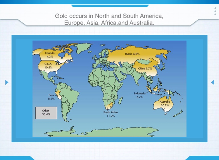 Gold occurs in North and South America, Europe, Asia, Africa,and Australia.