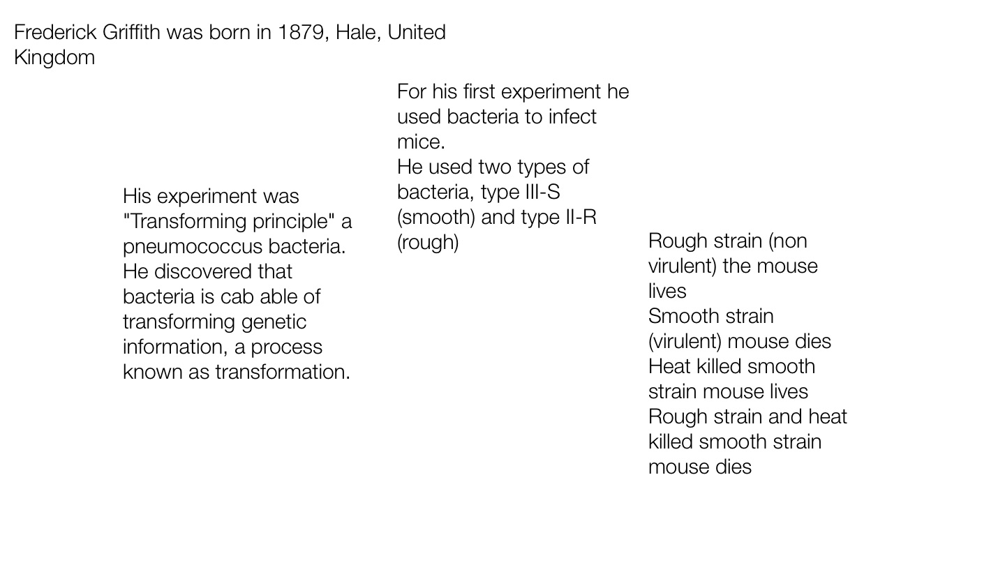 His experiment was "Transforming principle" a pneumococcus bacteria. He discovered that bacteria is cab able of transforming genetic information, a process known as transformation.