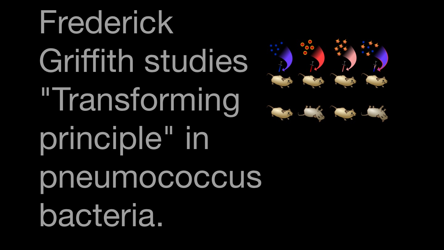 Frederick Griffith studies "Transforming principle" in pneumococcus bacteria.