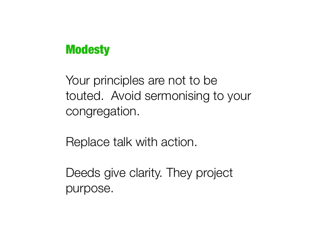 Your principles are not to be touted. Avoid sermonising to your congregation.