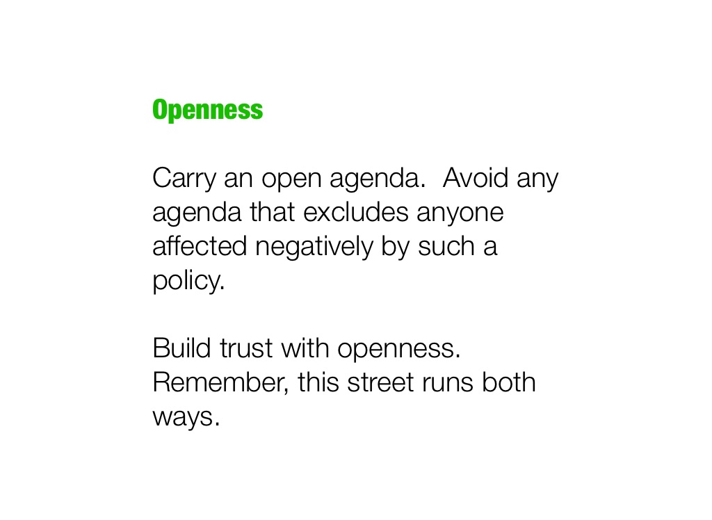 Carry an open agenda. Avoid any agenda that excludes anyone affected negatively by such a policy.