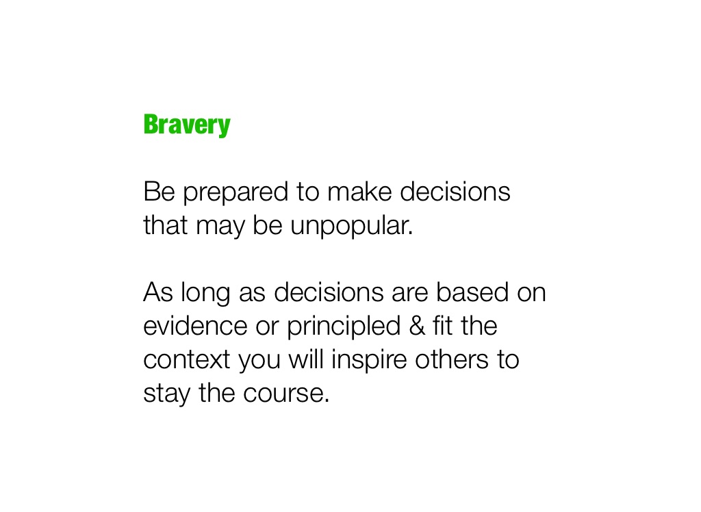 As long as decisions are based on evidence or principled & fit the context you will inspire others to stay the course.