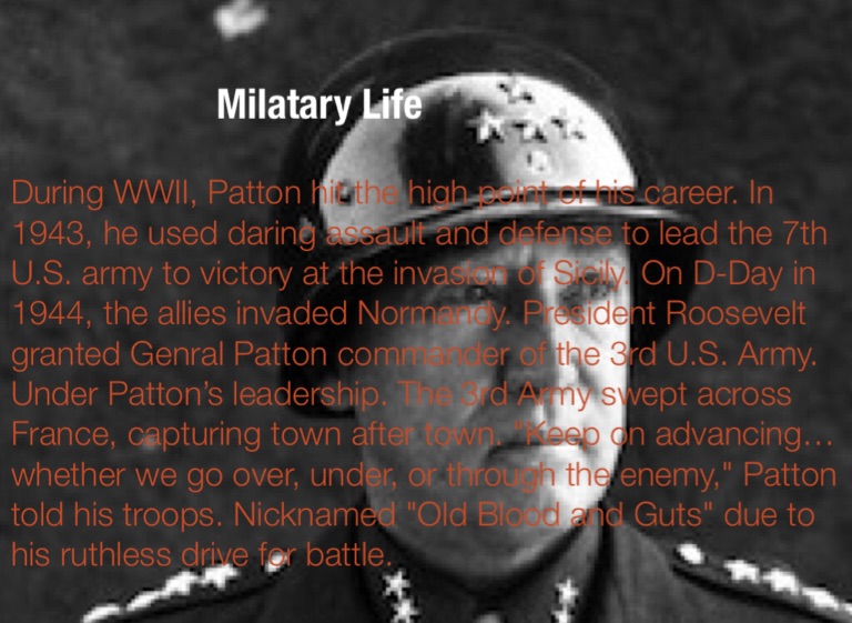 During WWII, Patton hit the high point of his career. In 1943, he used daring assault and defense to lead the 7th U.S. army to victory at the invasion of Sicily. On D-Day in 1944, the allies invaded Normandy. President Roosevelt granted Genral Patton commander of the 3rd U.S. Army. Under Patton’s leadership. The 3rd Army swept across France, capturing town after town. "Keep on advancing… whether we go over, under, or through the enemy," Patton told his troops. Nicknamed "Old Blood and Guts" due to his ruthless drive for battle.
