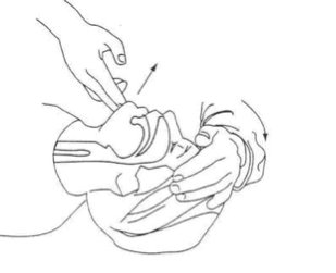 Antes de realizar este paso, se debe revisar que no haya ningún objeto en la boca del paciente, y se debe hacer un barrido de boca con el dedo índice si es adulto, y meñique si es niño, siempre en forma de gancho.