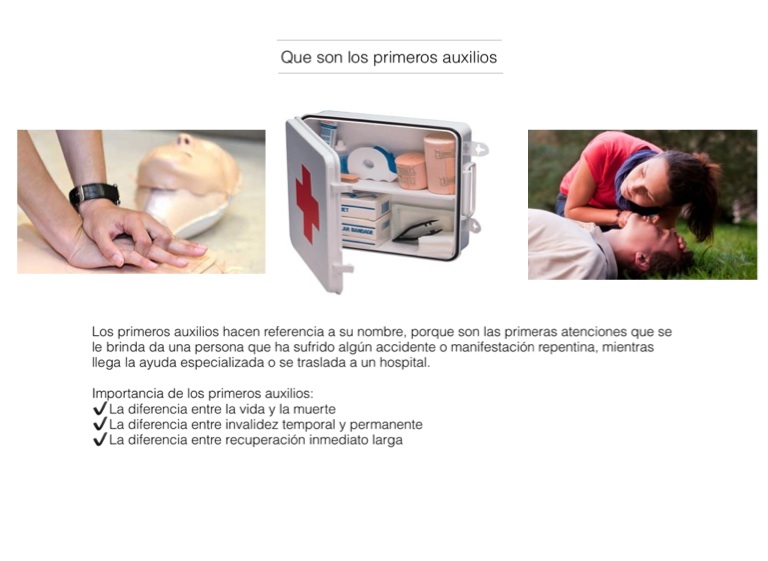 Los primeros auxilios hacen referencia a su nombre, porque son las primeras atenciones que se le brinda da una persona que ha sufrido algún accidente o manifestación repentina, mientras llega la ayuda especializada o se traslada a un hospital.