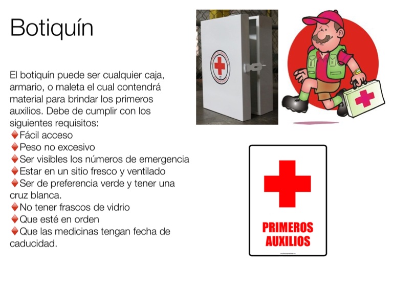El botiquín puede ser cualquier caja, armario, o maleta el cual contendrá material para brindar los primeros auxilios. Debe de cumplir con los siguientes requisitos: