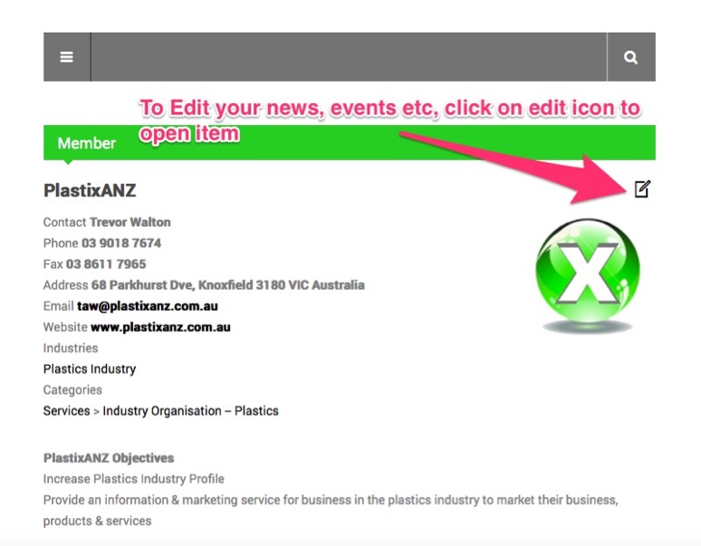 Edit your news, events, products, services, library — click the icon — item opens, make changes you require, Save & inspect your work