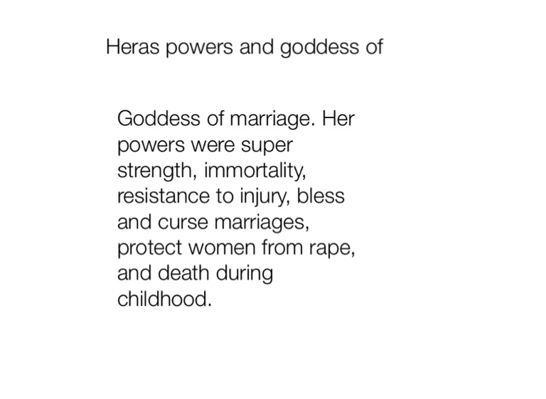 Goddess of marriage. Her powers were super strength, immortality, resistance to injury, bless and curse marriages, protect women from rape, and death during childhood.