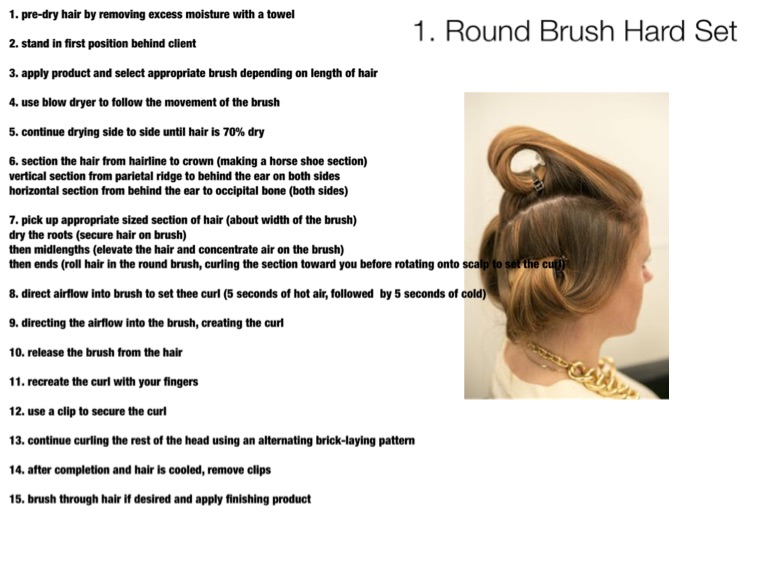 then ends (roll hair in the round brush, curling the section toward you before rotating onto scalp to set the curl)