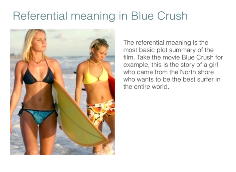 The referential meaning is the most basic plot summary of the film. Take the movie Blue Crush for example, this is the story of a girl who came from the North shore who wants to be the best surfer in the entire world.