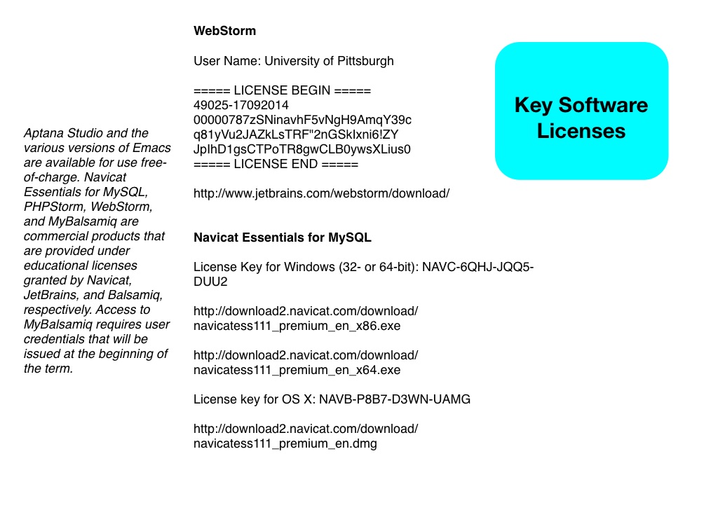 Aptana Studio and the various versions of Emacs are available for use free-of-charge. Navicat Essentials for MySQL, PHPStorm, WebStorm, and MyBalsamiq are commercial products that are provided under educational licenses granted by Navicat, JetBrains, and Balsamiq, respectively. Access to MyBalsamiq requires user credentials that will be issued at the beginning of the term.
