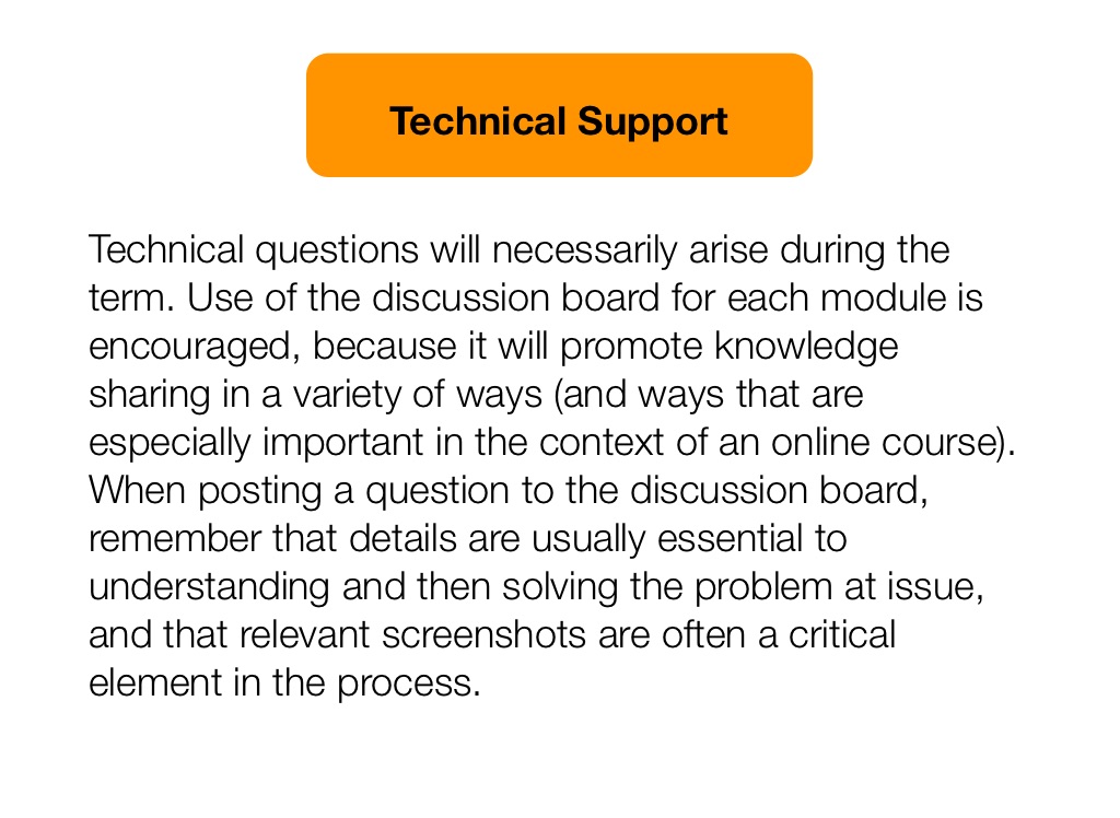 Technical questions will necessarily arise during the term. Use of the discussion board for each module is encouraged, because it will promote knowledge sharing in a variety of ways (and ways that are especially important in the context of an online course). When posting a question to the discussion board, remember that details are usually essential to understanding and then solving the problem at issue, and that relevant screenshots are often a critical element in the process.