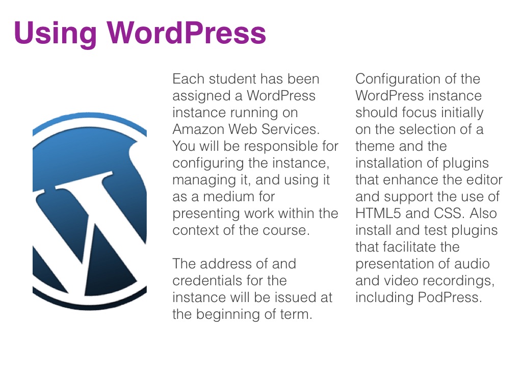 Each student has been assigned a WordPress instance running on Amazon Web Services. You will be responsible for configuring the instance, managing it, and using it as a medium for presenting work within the context of the course.