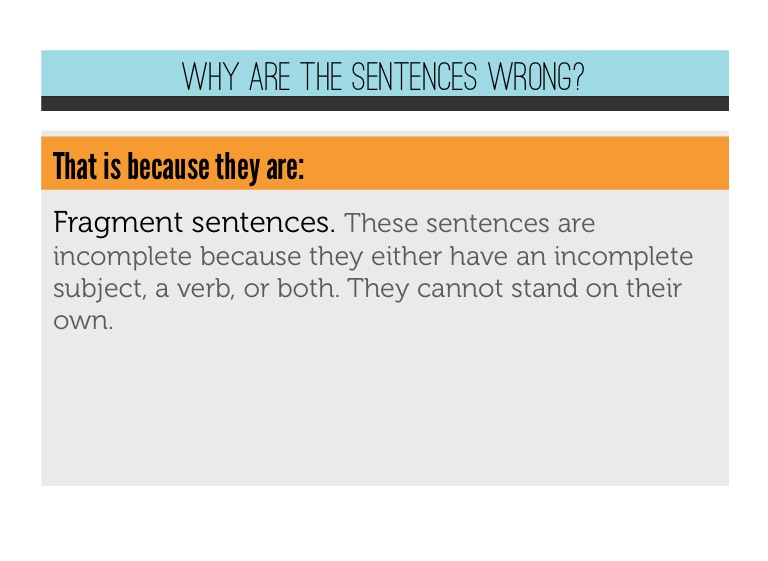 Fragment sentences. These sentences are incomplete because they either have an incomplete subject, a verb, or both. They cannot stand on their own.