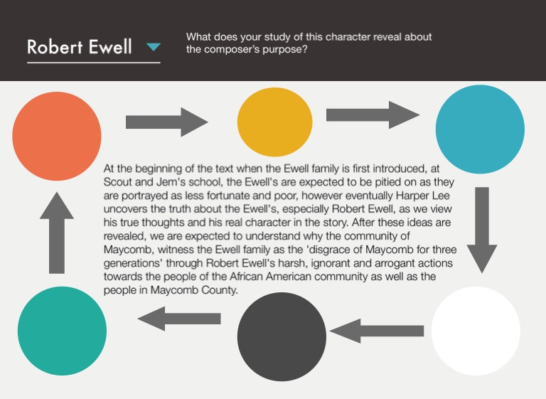 At the beginning of the text when the Ewell family is first introduced, at Scout and Jem's school, the Ewell's are expected to be pitied on as they are portrayed as less fortunate and poor, however eventually Harper Lee uncovers the truth about the Ewell's, especially Robert Ewell, as we view his true thoughts and his real character in the story. After these ideas are revealed, we are expected to understand why the community of Maycomb, witness the Ewell family as the 'disgrace of Maycomb for three generations' through Robert Ewell's harsh, ignorant and arrogant actions towards the people of the African American community as well as the people in Maycomb County.