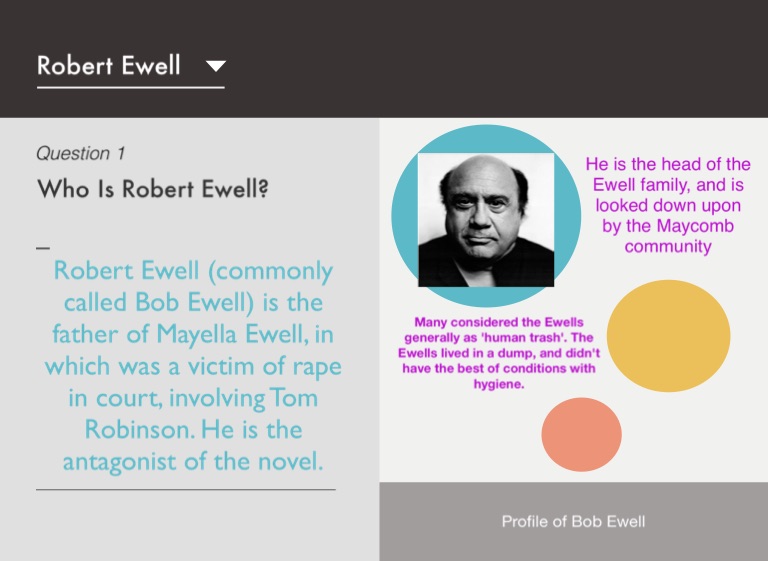 Robert Ewell (commonly called Bob Ewell) is the father of Mayella Ewell, in which was a victim of rape in court, involving Tom Robinson. He is the antagonist of the novel.