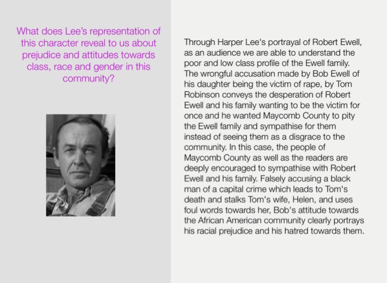Through Harper Lee's portrayal of Robert Ewell, as an audience we are able to understand the poor and low class profile of the Ewell family. The wrongful accusation made by Bob Ewell of his daughter being the victim of rape, by Tom Robinson conveys the desperation of Robert Ewell and his family wanting to be the victim for once and he wanted Maycomb County to pity the Ewell family and sympathise for them instead of seeing them as a disgrace to the community. In this case, the people of Maycomb County as well as the readers are deeply encouraged to sympathise with Robert Ewell and his family. Falsely accusing a black man of a capital crime which leads to Tom's death and stalks Tom's wife, Helen, and uses foul words towards her, Bob's attitude towards the African American community clearly portrays his racial prejudice and his hatred towards them.