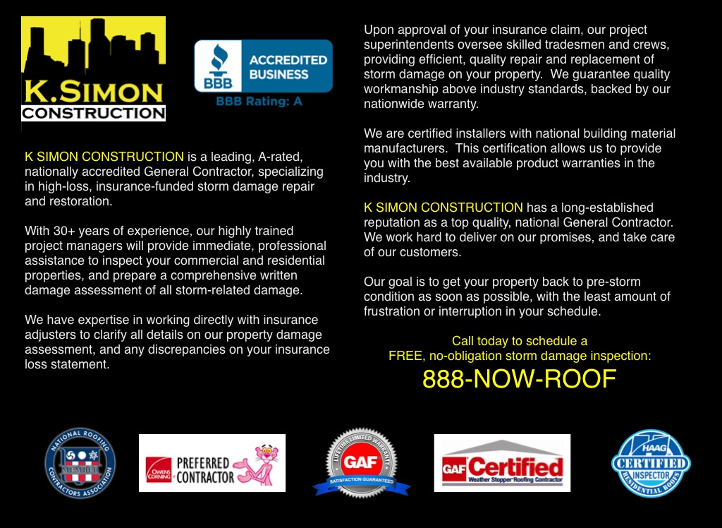K SIMON CONSTRUCTION is a leading, A-rated, nationally accredited General Contractor, specializing in high-loss, insurance-funded storm damage repair and restoration.