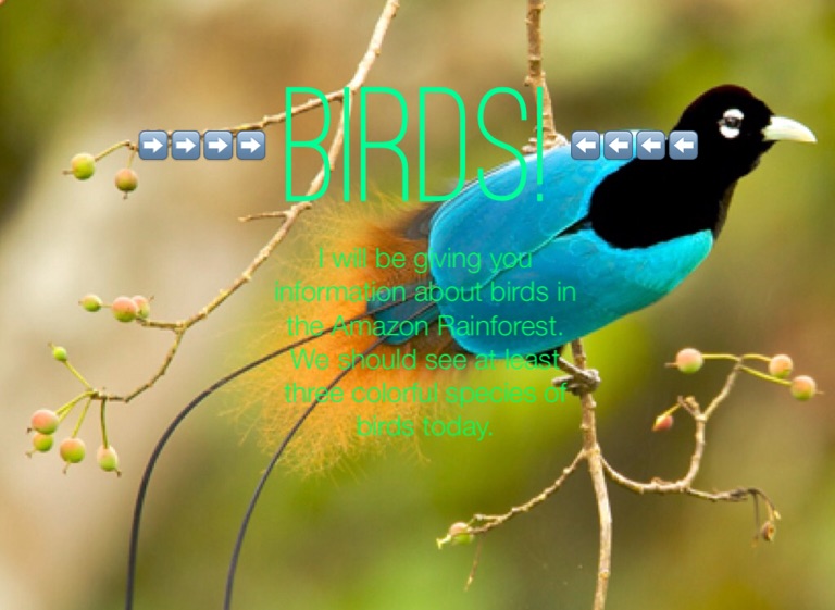 I will be giving you information about birds in the Amazon Rainforest. We should see at least three colorful species of birds today.
