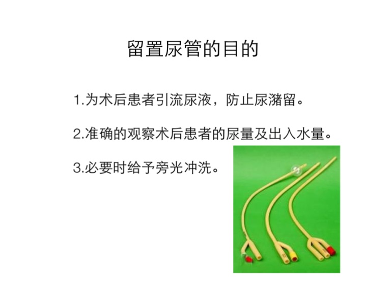 1.为术后患者引流尿液,防止尿潴留。 2.准确的观察术后患者的尿量及出入水量。 3.必要时给予旁光冲洗。