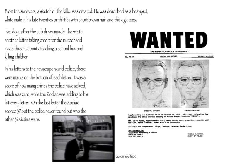In his letters to the newspapers and police, there were marks on the bottom of each letter. It was a score of how many crimes the police have solved, which was zero, while the Zodiac was adding to his list every letter. On the last letter the Zodiac scored 37 but the police never found out who the other 32 victims were.
