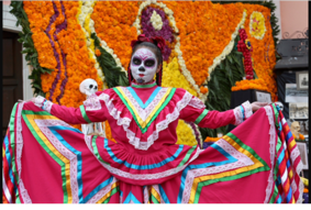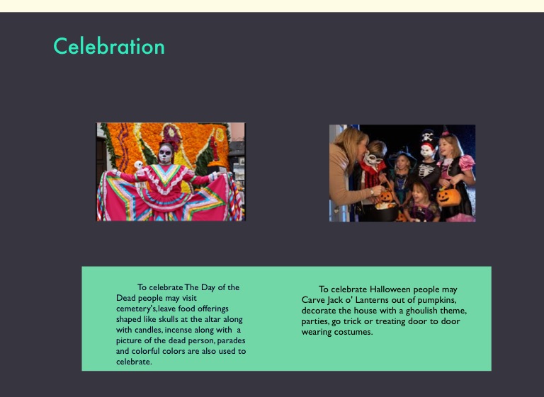 To celebrate The Day of the Dead people may visit cemetery's,leave food offerings shaped like skulls at the altar along with candles, incense along with a picture of the dead person, parades and colorful colors are also used to celebrate.