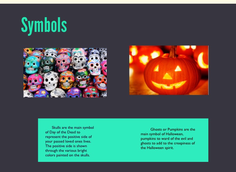 Skulls are the main symbol of Day of the Dead to represent the positive side of your passed loved ones lives. The positive side is shown through the various bright colors painted on the skulls.