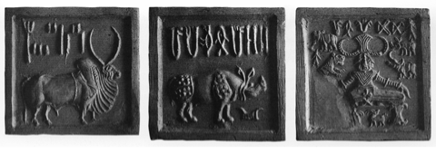 To the right you see Steatite Seals. These are slabs of clay engraved with animal figures often accompanied by pictographic script.