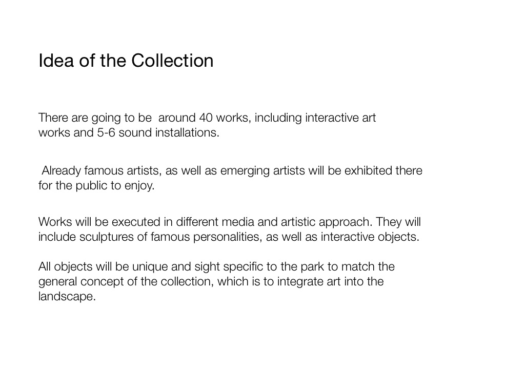 All objects will be unique and sight specific to the park to match the general concept of the collection, which is to integrate art into the landscape.