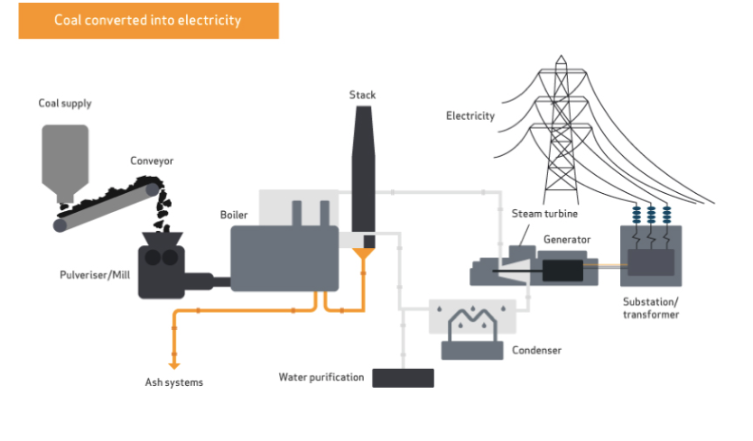 Steam turns a turbine engine, transforming heat energy from burning coal into mechanical energy