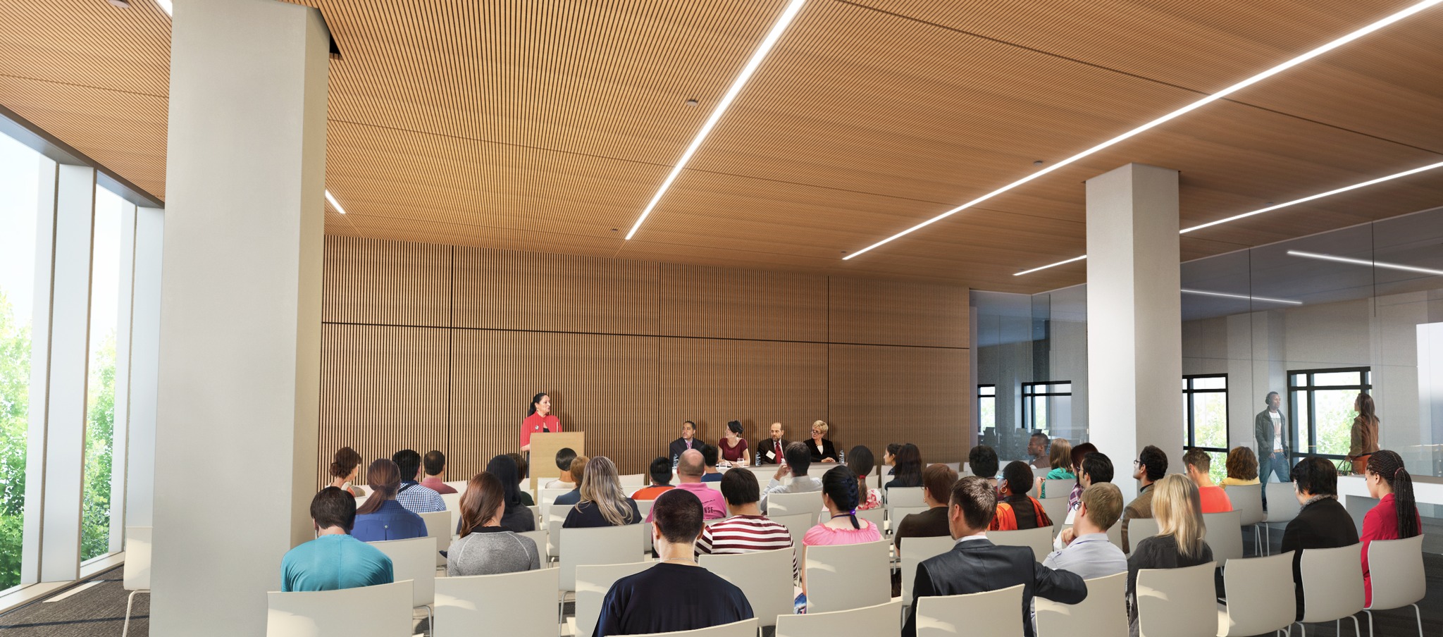 The Forum, on the second floor, has a capacity of 72 and is an interactive space which can be used for meetings, conferences, panel discussions, special events, and classes.