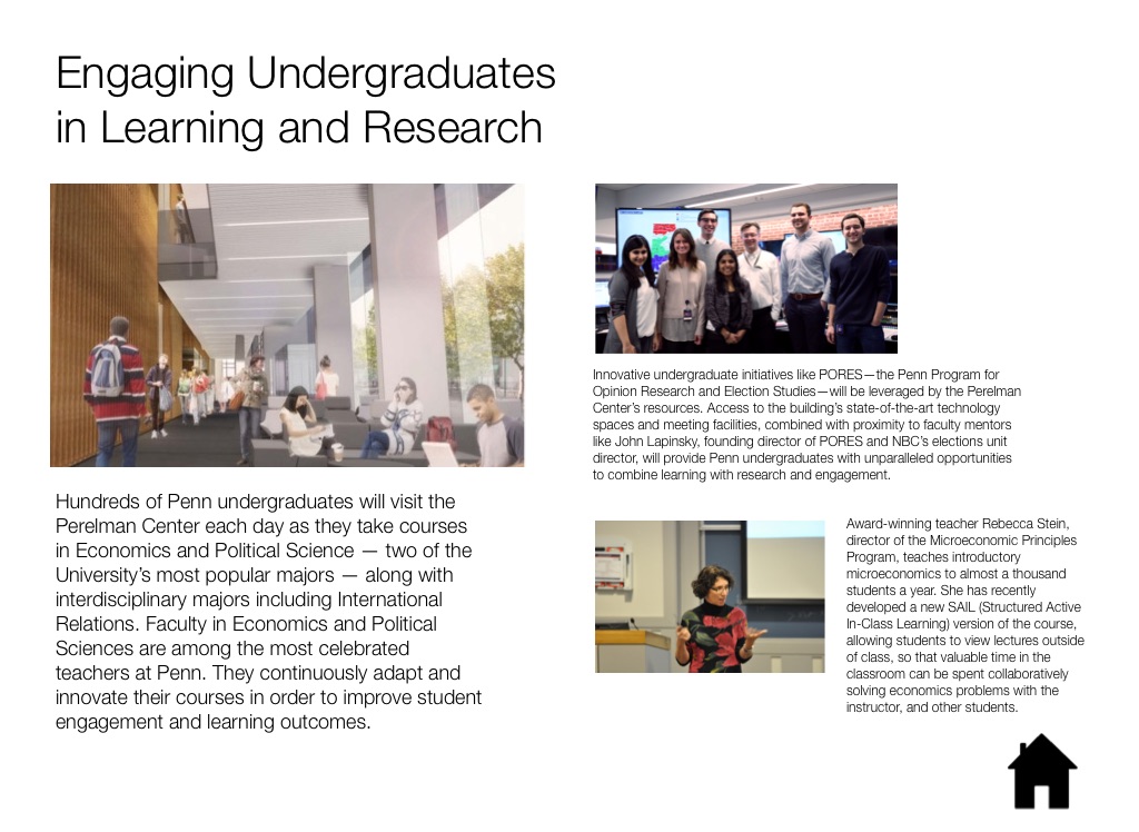 Hundreds of Penn undergraduates will visit the Perelman Center each day as they take courses in Economics and Political Science — two of the University’s most popular majors — along with interdisciplinary majors including International Relations. Faculty in Economics and Political Sciences are among the most celebrated teachers at Penn. They continuously adapt and innovate their courses in order to improve student engagement and learning outcomes.