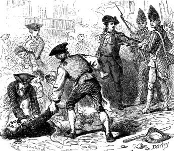 The Boston Massacre re enacted every year on March 5th, on the actual site in front of the old state house.