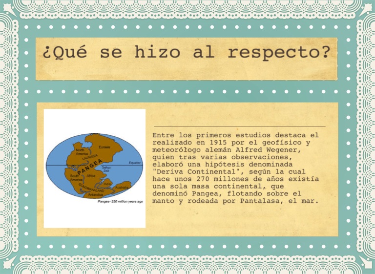 Entre los primeros estudios destaca el realizado en 1915 por el geofísico y meteorólogo alemán Alfred Wegener, quien tras varias observaciones, elaboró una hipótesis denominada "Deriva Continental", según la cual hace unos 270 millones de años existía una sola masa continental, que denominó Pangea, flotando sobre el manto y rodeada por Pantalasa, el mar.