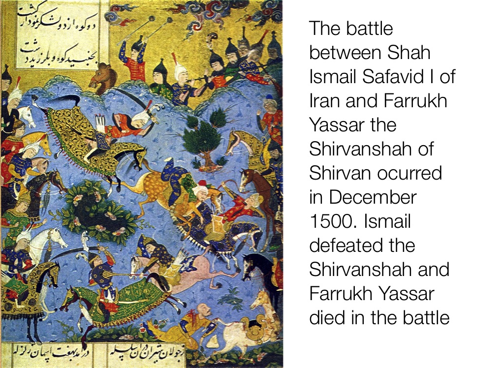 The battle between Shah Ismail Safavid I of Iran and Farrukh Yassar the Shirvanshah of Shirvan ocurred in December 1500. Ismail defeated the Shirvanshah and Farrukh Yassar died in the battle
