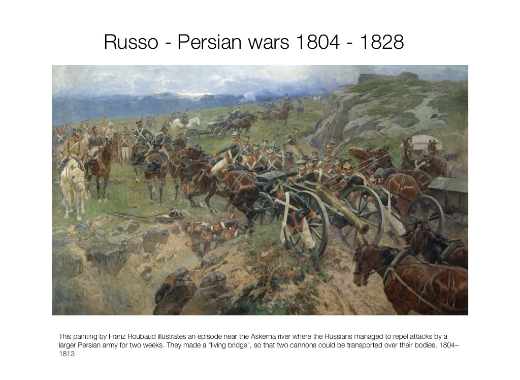 This painting by Franz Roubaud illustrates an episode near the Askerna river where the Russians managed to repel attacks by a larger Persian army for two weeks. They made a "living bridge", so that two cannons could be transported over their bodies. 1804–1813