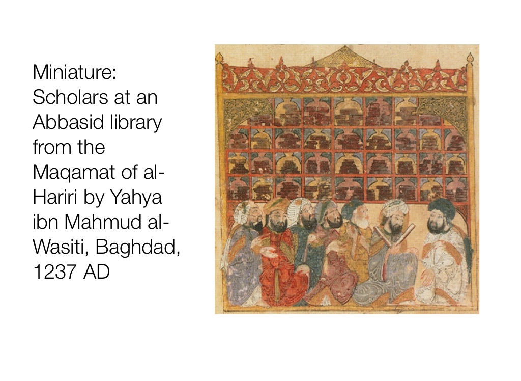 Miniature: Scholars at an Abbasid library from the Maqamat of al-Hariri by Yahya ibn Mahmud al-Wasiti, Baghdad, 1237 AD