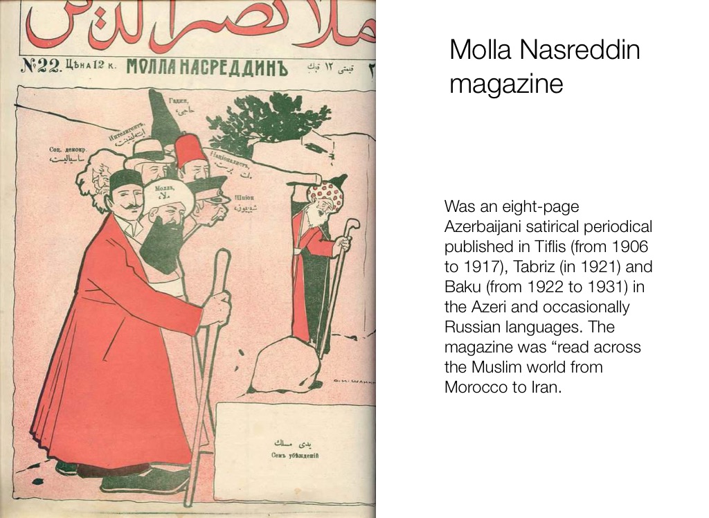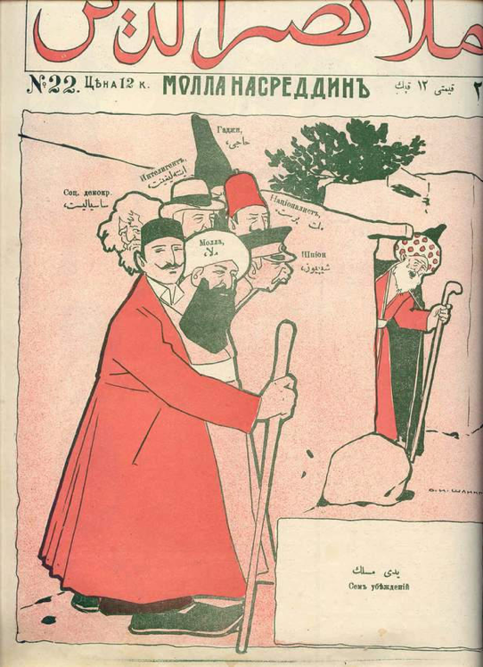 Was an eight-page Azerbaijani satirical periodical published in Tiflis (from 1906 to 1917), Tabriz (in 1921) and Baku (from 1922 to 1931) in the Azeri and occasionally Russian languages. The magazine was “read across the Muslim world from Morocco to Iran.