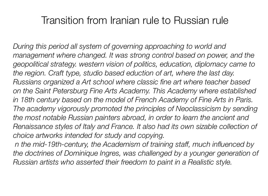 During this period all system of governing approaching to world and management where changed. It was strong control based on power, and the geopolitical strategy. western vision of politics, education, diplomacy came to the region. Craft type, studio based eduction of art, where the last day. Russians organized a Art school where classic fine art where teacher based on the Saint Petersburg Fine Arts Academy. This Academy where established in 18th century based on the model of French Academy of Fine Arts in Paris.