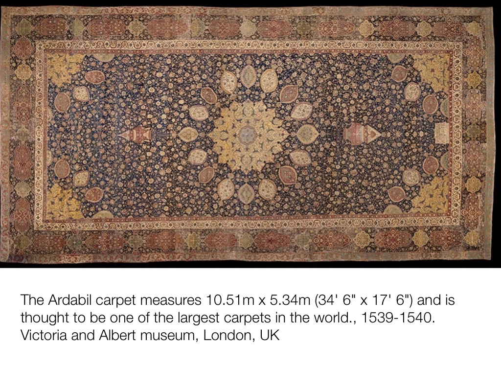 The Ardabil carpet measures 10.51m x 5.34m (34' 6" x 17' 6") and is thought to be one of the largest carpets in the world., 1539-1540. Victoria and Albert museum, London, UK
