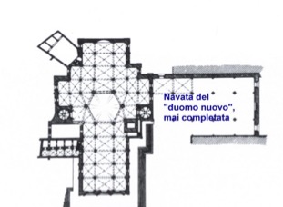 La pianta è a croce latina, successivamente ampliata da Pisano.